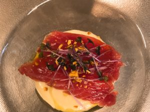 最近の料理を少し紹介します コースでの一品で茄子と甘酒、生クリームのスープ(濃度は濃いめ)の上に鮎魚醤でマリネした戻り鰹、紫キャベツのスプラウト、ローストして刻んだアーモンドをふりかけてます。 軽く鰹は燻製にしても美味し…