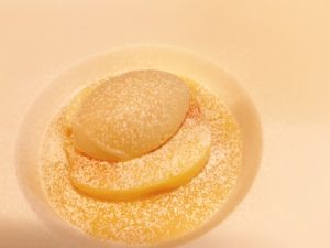 そのまんまです(笑) 半分に切った桃に、もものジェラートに、 モモのスープの組み合わせです 季節限定ですね